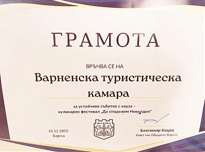 По време на предпразничното тържество, организирано от Община Варна на 16.12.2025 г., на което присъстваха представители на туристическите фирми и организации, Варненска туристическа камара бе отличена с грамота за устойчиво събитие с кауза. Отличието бе връчено от г-жа Снежана Апостолова – заместник-кмет на Община Варна във връзка с провеждането на 13-ти благотворителен кулинарен фестивал „Да споделим Никулден“.
